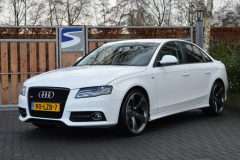 Audi A4 1.8 TFSI S-line, voorzien van o.a.: airco, origineel audiosysteem, beige lederen interieur, houtinleg interieur, xenon verlichting, parkeersensoren voor en achter, mistlampen voor, 20″ lichtmetalen velgen, elektrische ramen voor en achter, centrale vergrendeling op afstand, 2 sleutels, privacy glas achter, middenarmsteun, onderhoudsboekjes ingevuld aanwezig.